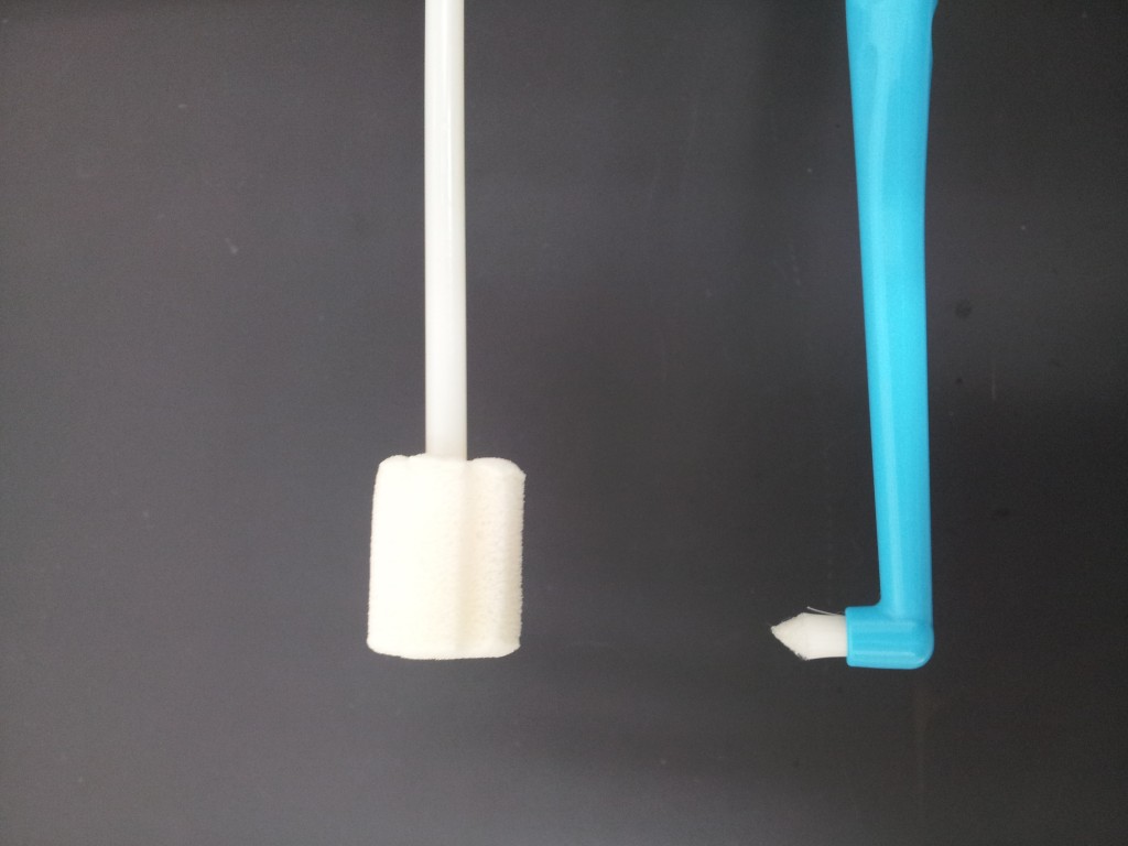 スポンジブラシ(写真左)は、頬の内側、舌の表面、上あごに当て 回転させながら使います。