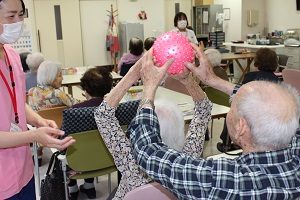 2班に分かれ、縦一列に並び頭の上で次の人にボールを送っていくゲームです。勝負事はみなさん真剣に参加され「どっちが勝った?」と結果が気になる様子です。 集団でしか味わえない楽しさがあります。この日も、皆さんの笑顔の絶えない楽しい一日でした。 |