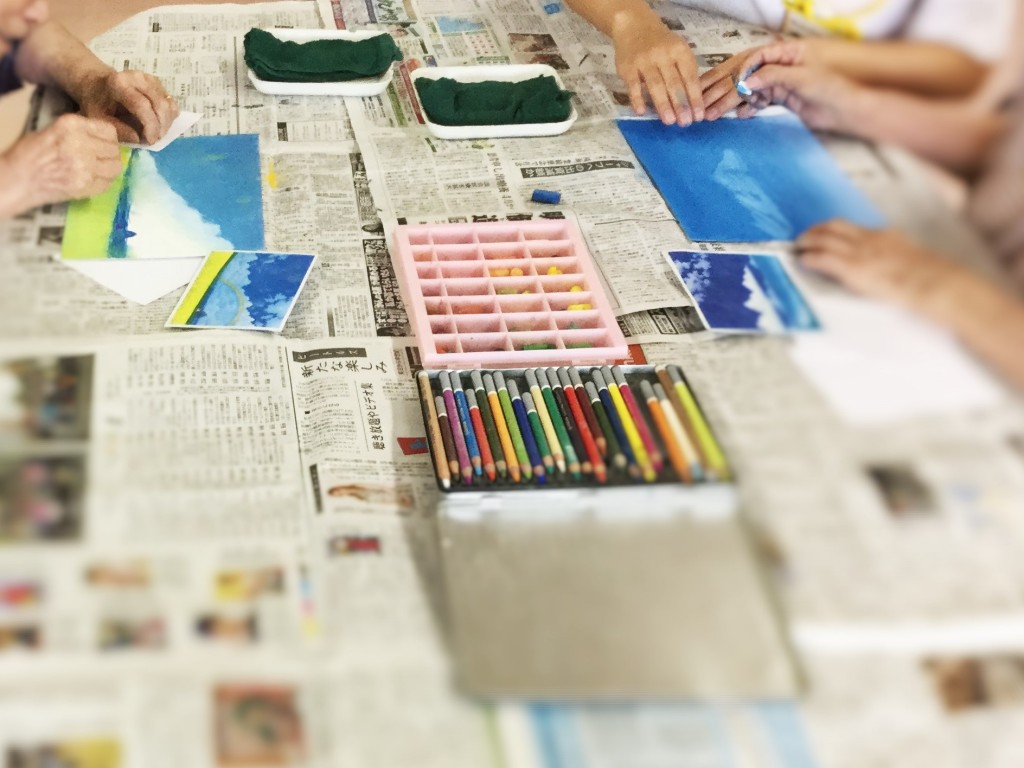 色を塗ったり、ぼかすために指を使うので、手の感覚・運動機能を高める効果があります。一時間程座って行うので座位の耐久性を上げる事が出来ます。また、どの色にしようかと考えたり、風景等の写真を見ながら描く事は回想する事になるので認知機能の訓練になります。