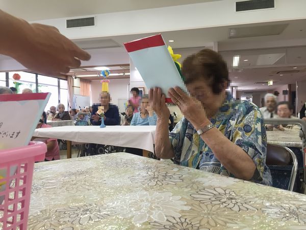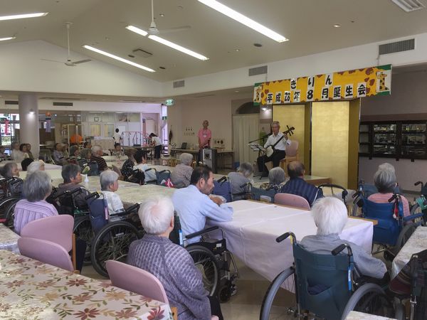 8月誕生会 8月誕生月の皆様、おめでとうございます。 ボランティアの方に三味線で 「真っ赤な太陽」「じょんがら節」などを演奏 して頂きました。♫♩ ♬~ 皆さん音楽に合わせて手拍子されていました。 スタッフからの手作りのプレゼントを受取られ 嬉しそうでした。 ☆特別ランチメニュー☆ 混ぜご飯、鮭の塩焼き、夏野菜のそうめん・・・などなど どれも美味しそうでした。