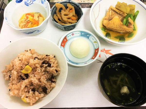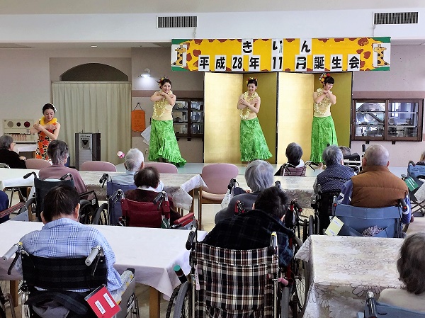 11月誕生会 11月誕生月の皆様、 おめでとうございます。 11月に入り朝夕冷え込むようになり、木々の葉が赤や黄色に色づく季節になりました。 今月の誕生会はフラダンス!! 普段なかなか見ることの出来ないフラダンスで、常夏の気分を味わって頂きました。 《誕生会特別メニュー》 ・栗入り赤飯 ・鯛の炊き合わせ ・きのこの炊き合わせ ・すまし汁 など