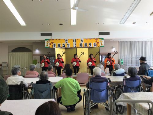 12月3日健きりんにて誕生会を行い、慰問の方々に三味線と、歌を披露して頂きました。