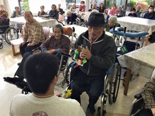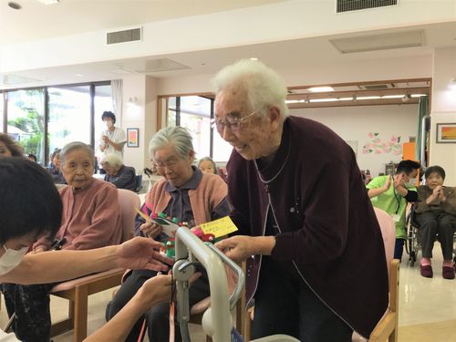 職員からの心のこもった手作りのプレゼントを手渡され「ありがとう~」と笑顔で受け取られていました。