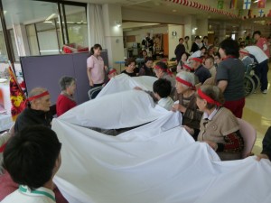4月におこなわれた運動会。シーツの両側を持ち物運びレースをおこなっています。みんなで協力して無事ゴールまで運ぶことができました。